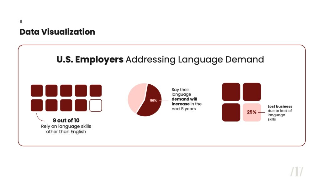 Copywriting and content structure translating business impact data into clear, outcome-driven messaging linking language training to productivity, retention, and profitability.